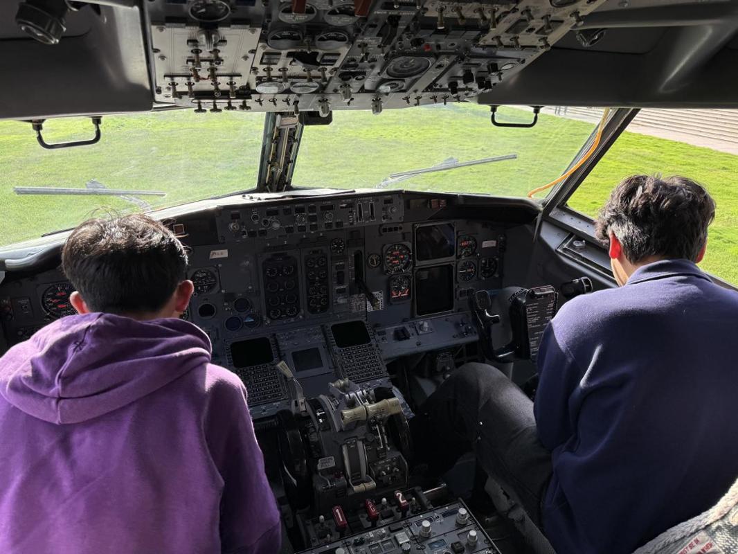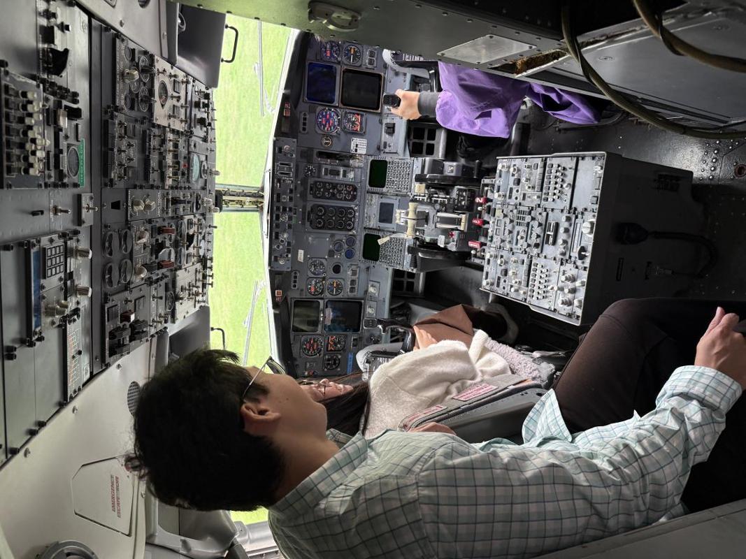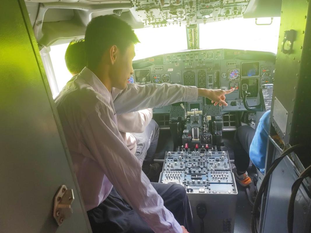 两位“飞友”正在聚精会神地研究驾驶舱的各个部件