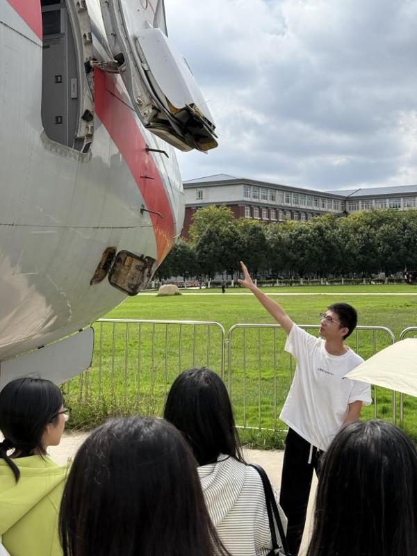 参与师生抵达活动现场后,首先由负责围场大门的同学逐一进行报名身份核验,并完成安全教育后,跟随协会飞行技术专业的资深讲解员开始飞机的外部讲解。